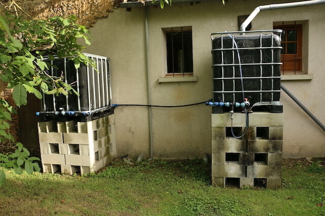 Cette solution permet de remplir au maximum tous les récupérateurs puisque le trop-plein se trouve à une hauteur supérieure par rapport aux autre cuves. Une rangée supplémentaire de parpaing permet d’obtenir ce résultat. Dans l’idéal, les récupérateurs d’eau sont également connectés à d’autres gouttières pour accroître le rendement.